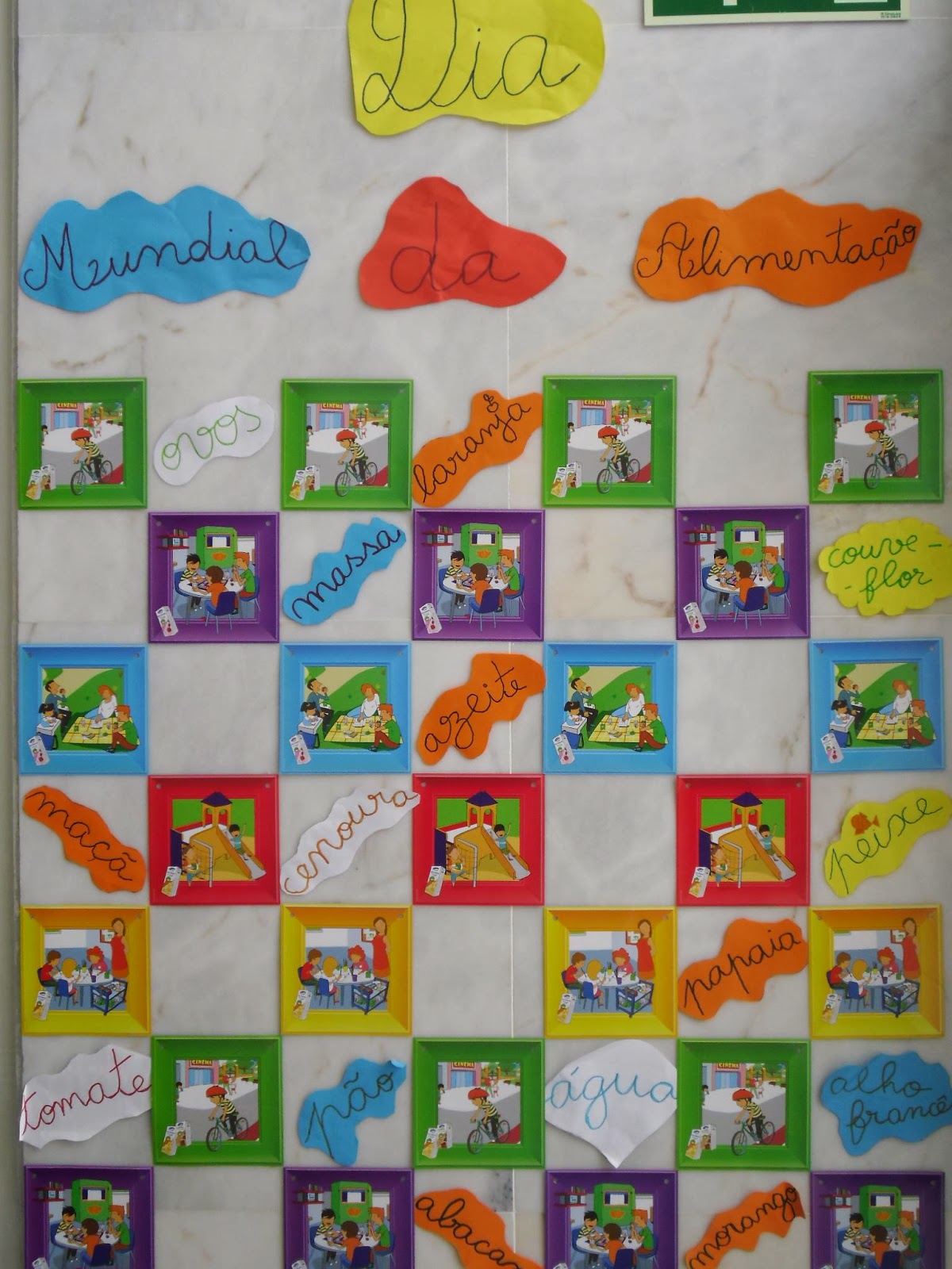 Os alunos da turma de 2º e 3º anos dialogaram sobre alimentação saudável, registaram o nome no quadro e em papel e formaram um painel com imagens coloridas que “A Mimosa” enviou para a nossa escola. Decoraram, assim, a entrada da escola que ficou muito colorida e com muitas informações sobre alimentos saudáveis, para toda a comunidade educativa.